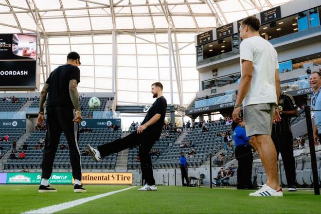 快船官方配文写到:“周日足球之夜,祖巴茨、博格丹·博格达诺维奇、科林斯一起现身观看今晚的洛杉矶FC比赛!”