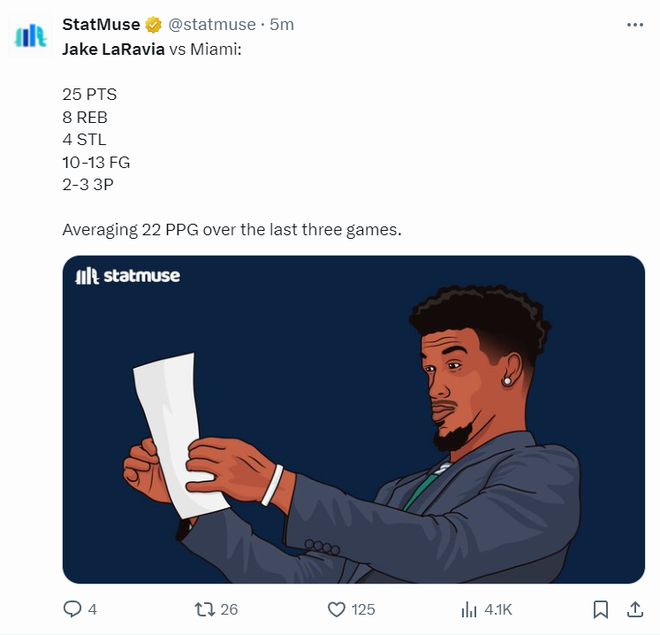 美媒晒出拉拉维亚此役25+8+4断的数据,写道:过去三场比赛拉拉维亚场均22分(场均21.7分7篮板2.7抢断)。